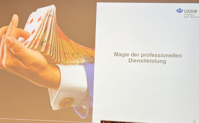 Im Rahmen einer internen Tagung und des Sommerfestes der Unfallkasse Baden-Württemberg habe ich über die „Magie der professionellen Dienstleistung“ gesprochen. Dabei habe ich mit praktischen Beispielen gezeigt, wie ich arbeite und wie das Team diese Arbeitsweise für sich nutzen kann.